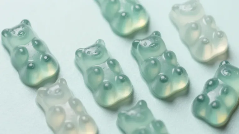 Close-up of translucent gummy bears with glossy, soft texture, illuminated by diffused light from above, creating highlights and reflections. The shallow depth of field and light, neutral background emphasize the gummy bears, providing ample copy space.