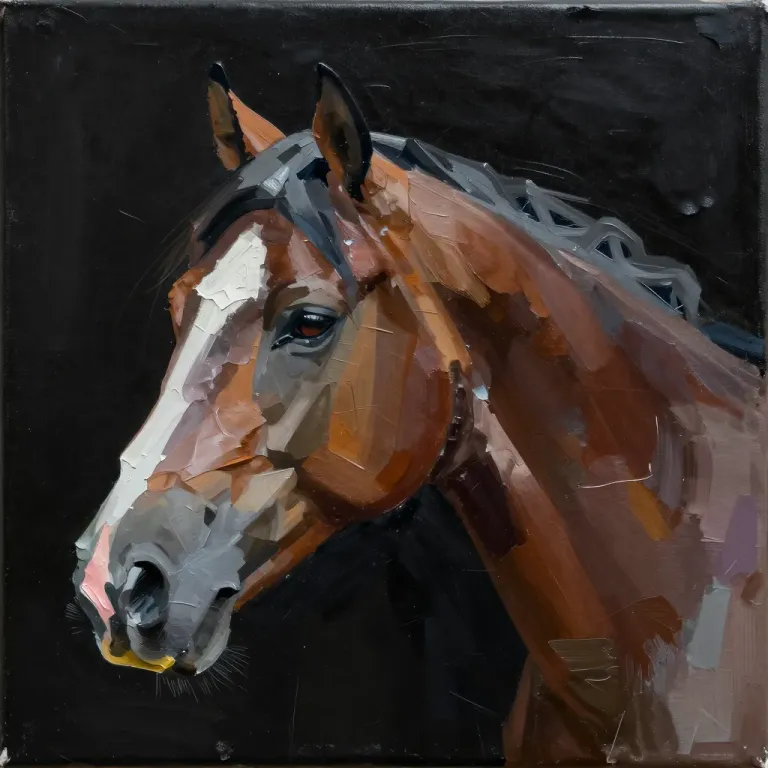 A close-up of a horse's head and neck, rendered with thick, impasto brushstrokes that highlight its texture and form. Directional light from the left creates strong shadows and highlights, emphasizing the horse's features against a black background.
