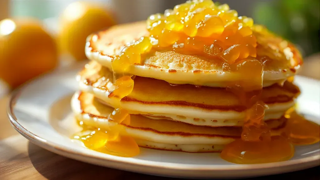 A stack of fluffy pancakes topped with glossy orange marmalade, bathed in warm, ambient light that creates soft shadows and highlights, emphasizing the texture and vibrant colors. The shallow depth of field blurs the background, focusing attention on the delicious breakfast dish.