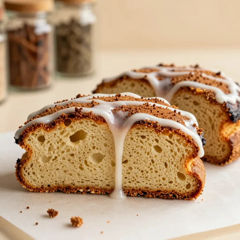 A close-up of freshly baked brioche bread with a glossy icing drizzle, showcasing its golden crust and airy interior. Warm, natural light highlights the bread's texture and icing, while a blurred background of spices and a neutral wall provides a clean and simple backdrop.