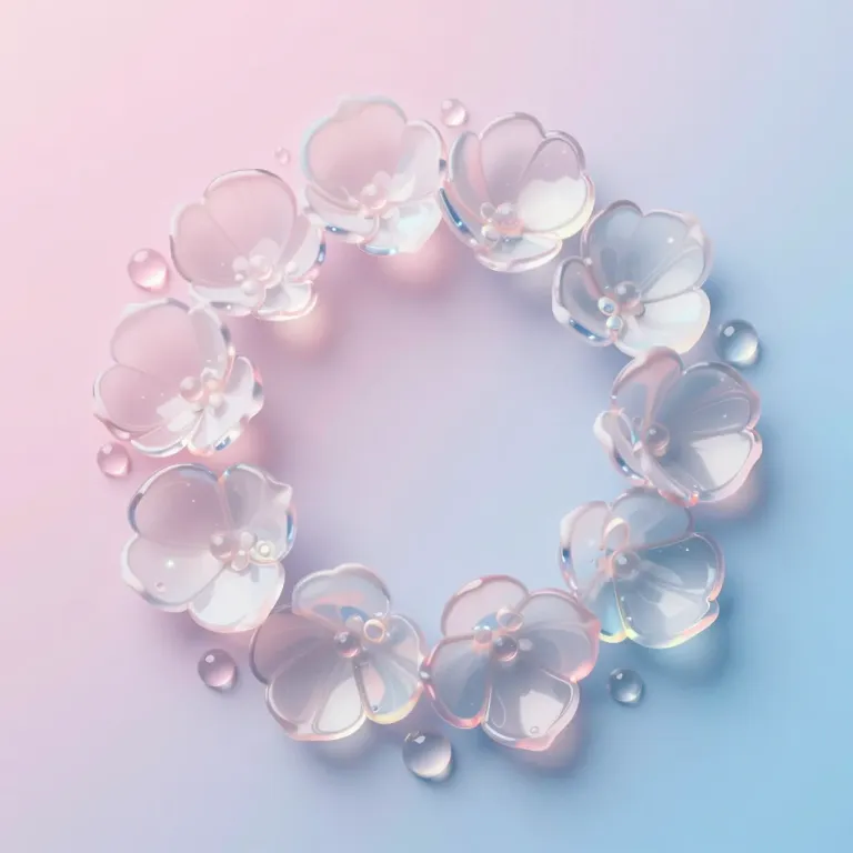 A circular arrangement of translucent glassy petals and beads, illuminated by soft, ambient light, creating a dreamy, pastel gradient background. The balanced and symmetrical composition offers ample copy space for design elements.