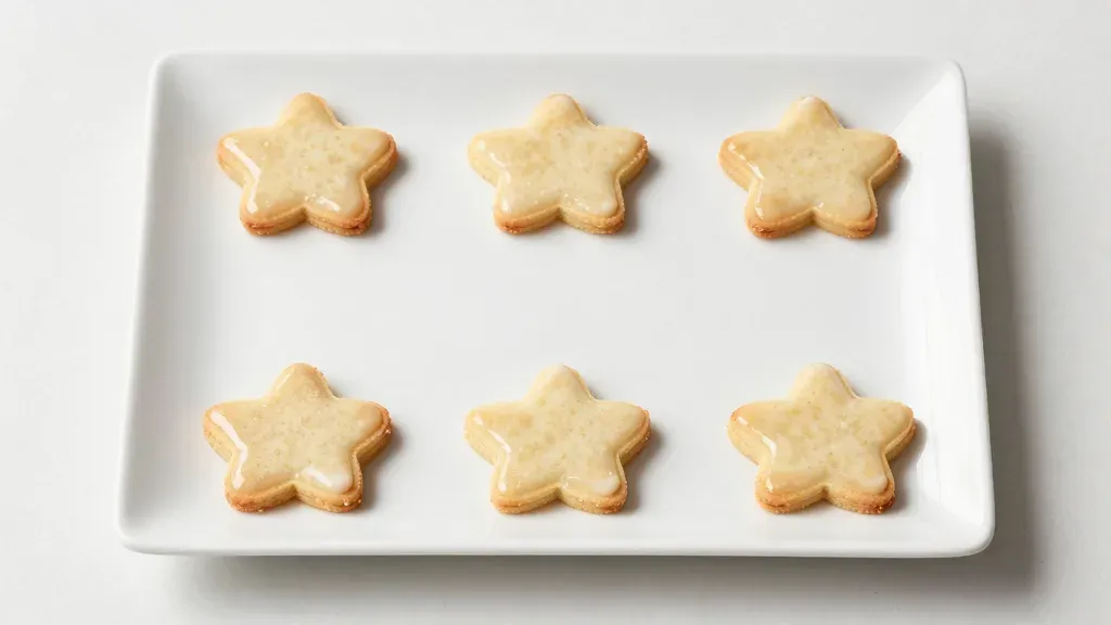 Golden star-shaped sugar cookies with glossy icing are neatly arranged on a white plate, highlighting their crisp edges and soft centers under soft, diffused lighting. The minimalistic white background ensures the cookies are the focal point.
