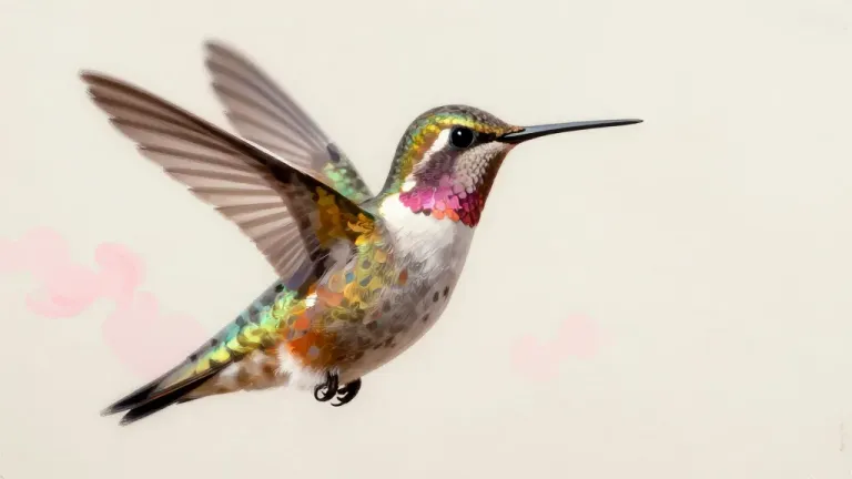 A hummingbird in flight, showcasing its iridescent plumage and translucent wings, bathed in soft, diffused light that highlights the shimmering effect. The slightly blurred background in soft pastel colors enhances the subject's vibrant colors and creates a serene atmosphere.