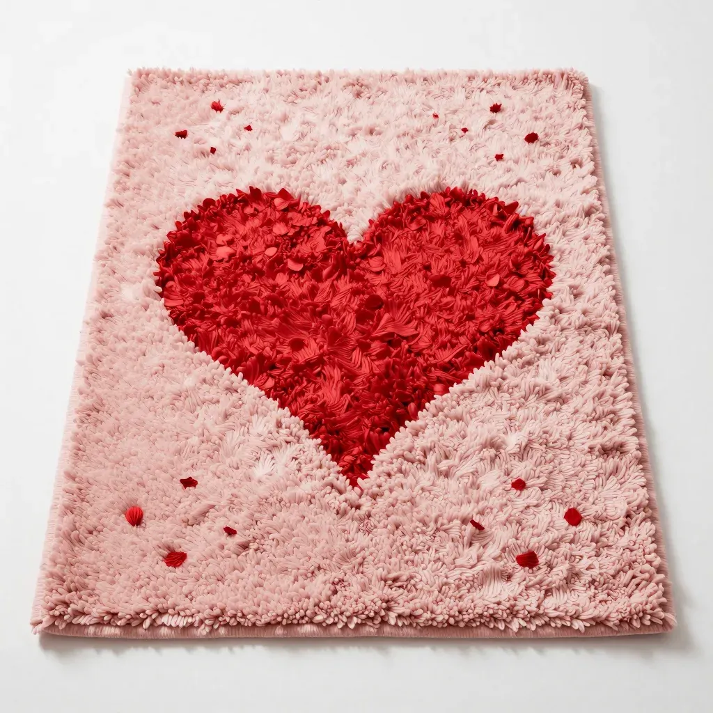 A soft, fluffy, plush heart accent throw rug with a red heart design and scattered white hearts, set against a diffused, soft lighting that creates gentle shadows and highlights, with a plain white background that draws focus to the rug.