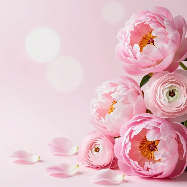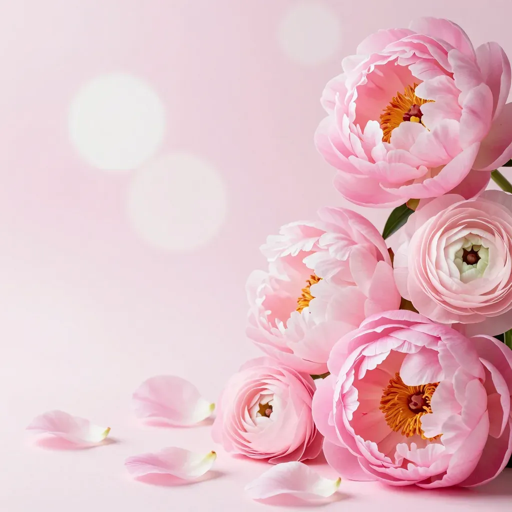 Delicate pink peonies with glossy petals and vibrant yellow centers softly illuminated, creating a dreamy, ethereal effect. The shallow depth of field and soft pink gradient background enhance the romantic and serene mood.