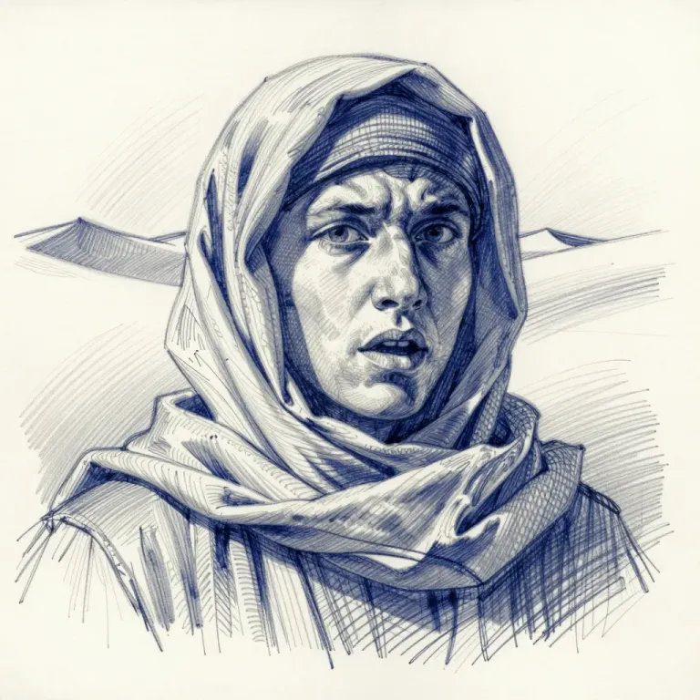 A close-up of a nomad woman wearing a headscarf, with fine lines and folds in the fabric, set against a soft, diffused background that hints at a desert landscape, creating a sense of depth and tranquility.