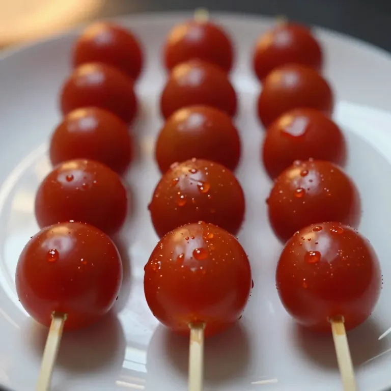Plump cherry tomatoes with glossy, wet-looking skin are skewered on wooden sticks and arranged in neat vertical rows on a white plate. Soft, warm, diffused lighting from above creates gentle highlights and shallow depth of field, with a blurred warm-toned background providing contrast and visual focus on the foreground.