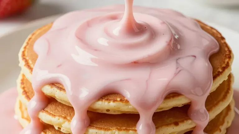 Golden-brown pancakes topped with glossy strawberry swirl cream, softly lit from above, creating a warm and inviting composition. The blurred background keeps the focus on the delicious, visually appealing dish.