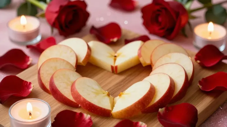 Sliced red apples form a heart shape on a wooden board, surrounded by velvety crimson rose petals and glowing candles, with crisp apple flesh and glossy skin catching warm candlelight. The shallow depth of field and low-angle perspective emphasize intimacy, while the soft-focus pink background provides a dreamy, romantic ambiance with subtle copy space.