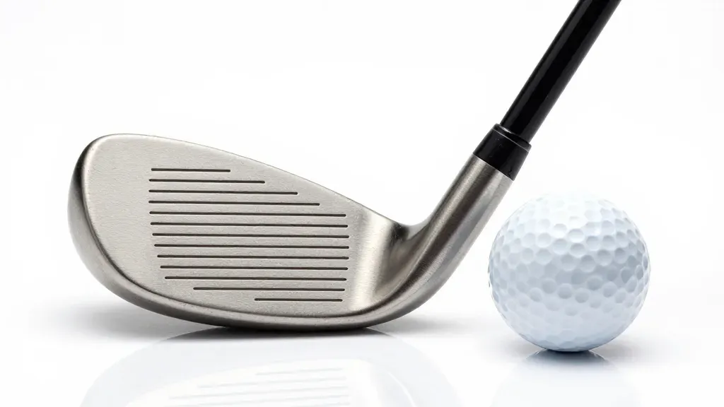 A metallic golf club with grooves and a dimpled white golf ball are captured in a close-up, soft-lit shot that highlights the textures and glossy finish. The clean white background and shallow depth of field emphasize the subjects, making it ideal for product showcases or sports-related content.