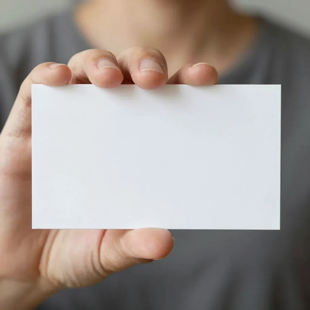 A hand delicately holds a smooth, blank white card against a soft, even light with gentle shadows, creating a clean and minimalist aesthetic. The shallow depth of field isolates the hand and card, emphasizing their simplicity and the potential for text or design.