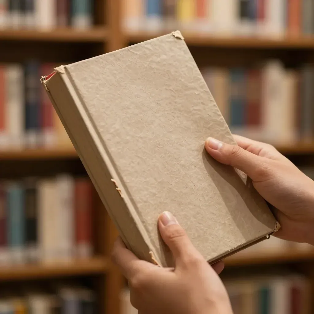 A hand gently holds a worn, brown paper-covered book, showcasing its frayed edges and texture under warm, ambient library lighting. The shallow depth of field draws focus to the hand and book, while the blurred background of library shelves adds depth and context.