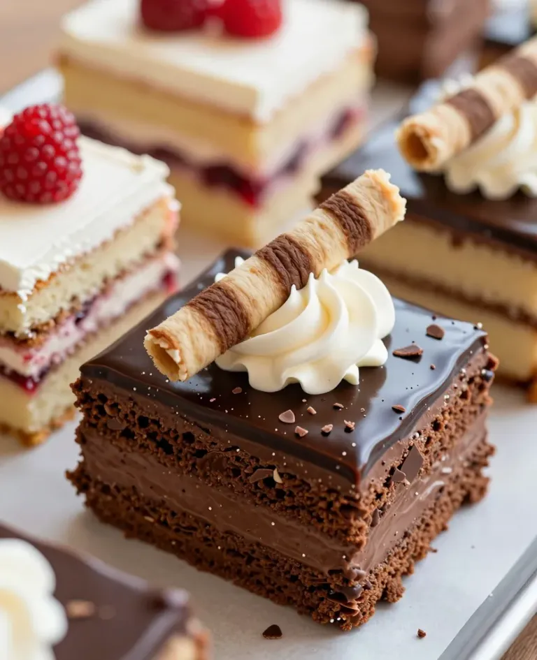 A close-up of a rich chocolate cake topped with glossy ganache, soft whipped cream, and a crispy wafer, illuminated by soft, diffused light that highlights the textures and glossy surface. The blurred background featuring other desserts adds depth and context to the image.
