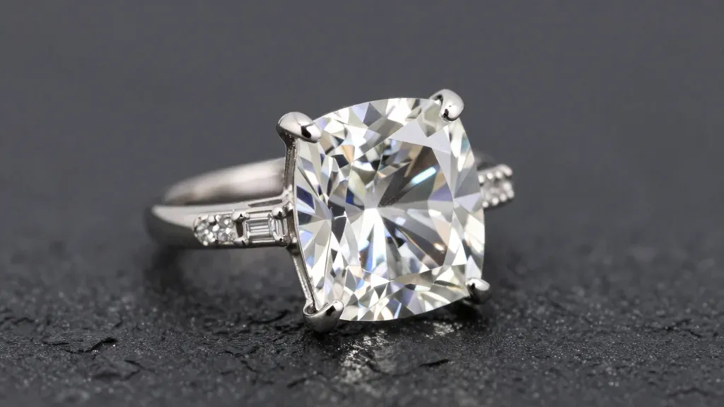 A close-up of a polished diamond engagement ring, highlighting its facets and intricate metalwork under soft, diffused lighting. The dark, textured background enhances the ring's clarity and elegance, providing a clean and focused composition.