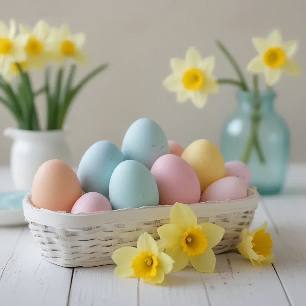 Softly lit pastel eggs nestled in a white wicker basket, surrounded by delicate daffodils, creating a dreamy, springtime scene. The gentle glow and soft focus enhance the serene and inviting atmosphere of the image.