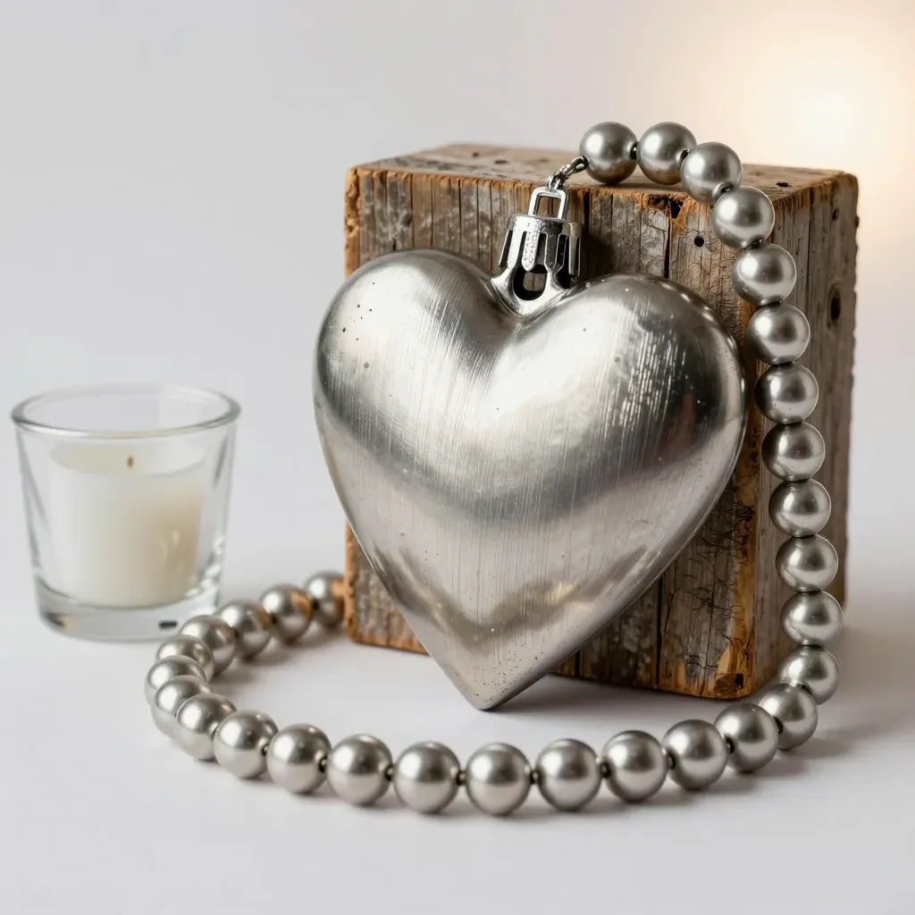 A heart-shaped metal ornament with a string of metallic beads, highlighted by soft, diffused light from a lit candle, creating reflections and highlights on the polished surfaces. The rustic wooden block and neutral beige wall in the background slightly blur the scene, emphasizing the foreground elements.