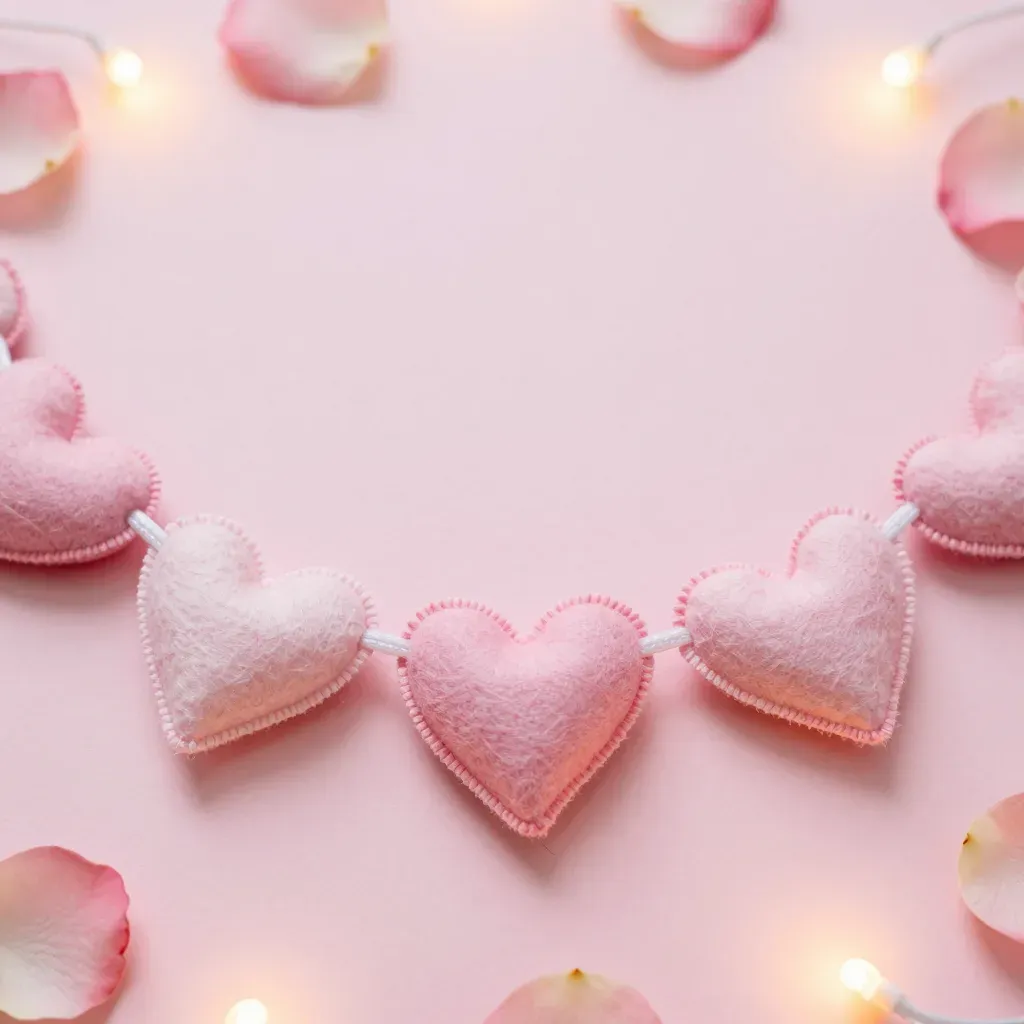 A row of soft pink felt hearts with visible stitching is strung horizontally, surrounded by scattered rose petals and glowing fairy lights that cast a warm, diffused radiance. The shallow depth of field and circular framing of lights and petals create a dreamy, ethereal mood with ample copy space in the background.