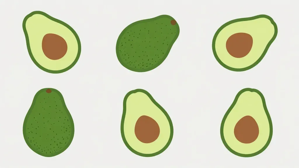 Three whole avocados with matte, rough skin and three halved avocados revealing creamy pale green flesh and smooth brown pits are arranged in a symmetrical 2x3 grid. Soft, diffused overhead lighting creates even illumination with no harsh shadows, and the plain off-white background provides clean, distraction-free framing with shallow depth of field keeping all elements in sharp focus.