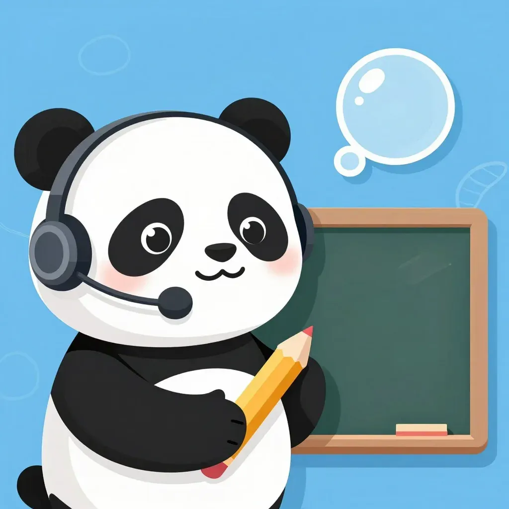 A panda wearing a headset and holding a pencil is centered in a classroom setting, with soft, even lighting highlighting its face. The simple background with a chalkboard and books slightly blurred keeps the focus on the panda, creating a clean and professional look.