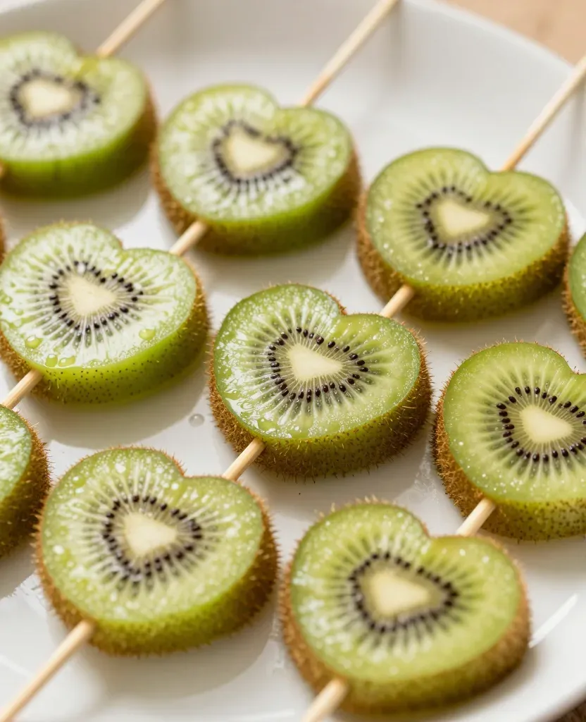 Sliced kiwi hearts on skewers arranged neatly on a white plate, showcasing their glossy, juicy texture under soft, diffused lighting. The clean background emphasizes the vibrant green color and natural sheen of the kiwi slices.