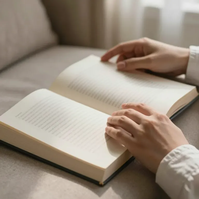 A close-up of hands gently resting on the pages of an open book, bathed in soft, diffused light that creates a warm and inviting glow. The shallow depth of field and neutral-toned background enhance the cozy ambiance, making this image perfect for themes of relaxation and contemplation.