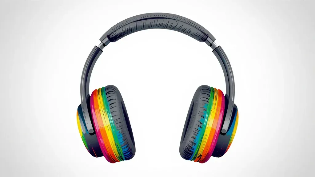 A pair of headphones with ear cups featuring a vibrant rainbow gradient, highlighted by directional lighting that emphasizes the glossy, paint-like texture. The plain white background ensures the headphones are the focal point, providing ample copy space for design integration.