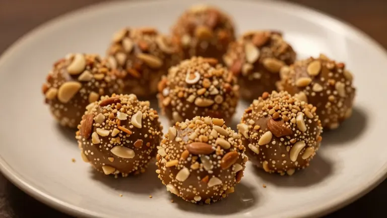 Round almond-butter bites are clustered on a white plate, their glossy surfaces coated with toasted sesame seeds and slivered almonds, creating a rich, textured appearance. Soft warm lighting from the upper left highlights the granular coating and shallow depth of field isolates the subject from the blurred neutral background.