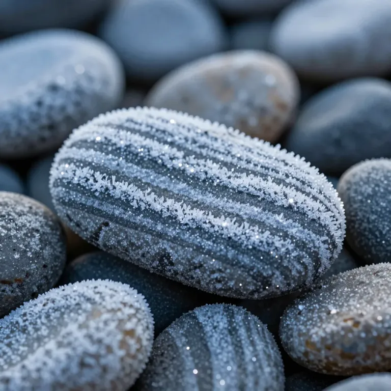 A close-up of frost-covered pebbles, showcasing their smooth, rounded texture and crystalline frost in cool tones, with diffused, soft lighting creating a shimmering effect. The blurred background of out-of-focus pebbles adds depth and context.