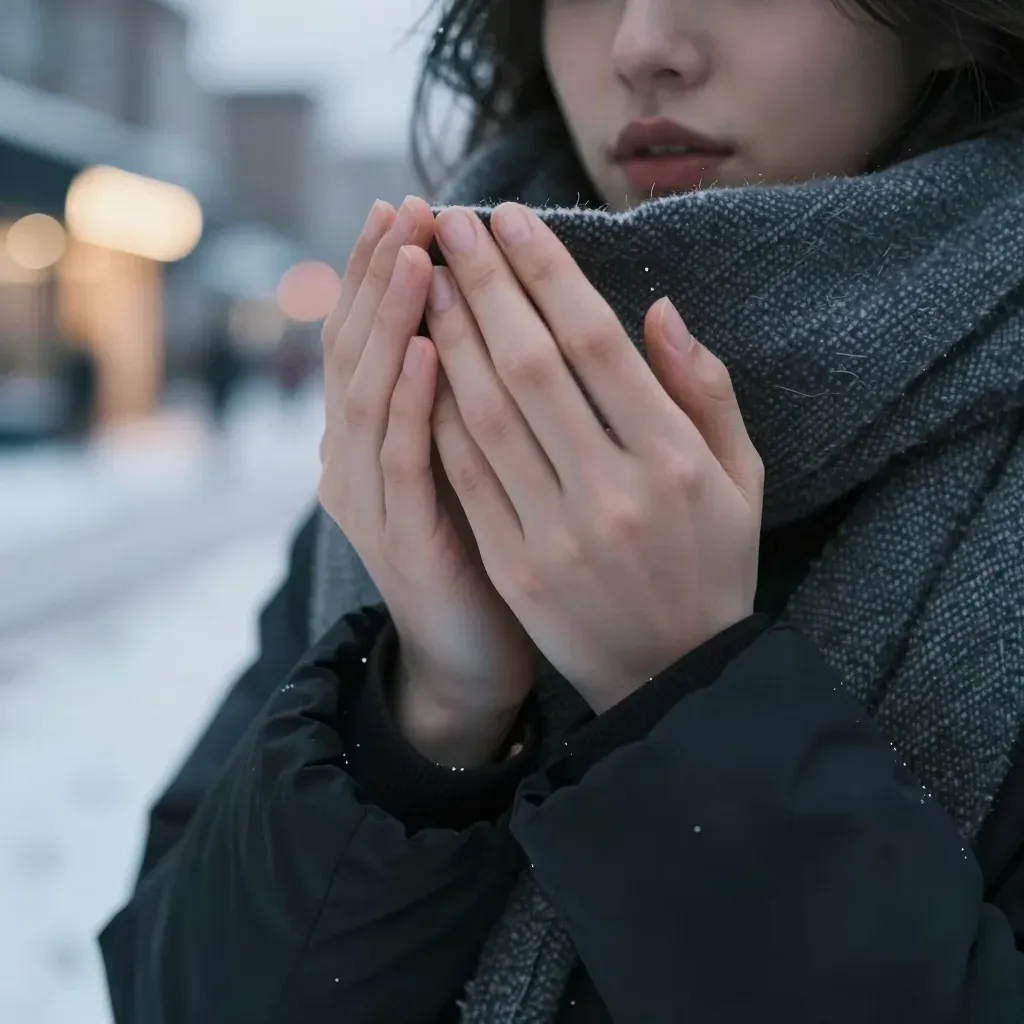 A person in a dark jacket and gray scarf clutches their hands together, creating a sense of warmth and protection against the cold. The soft, diffused lighting highlights the texture of the scarf and jacket, while the blurred cityscape in the background suggests a serene winter morning or evening.