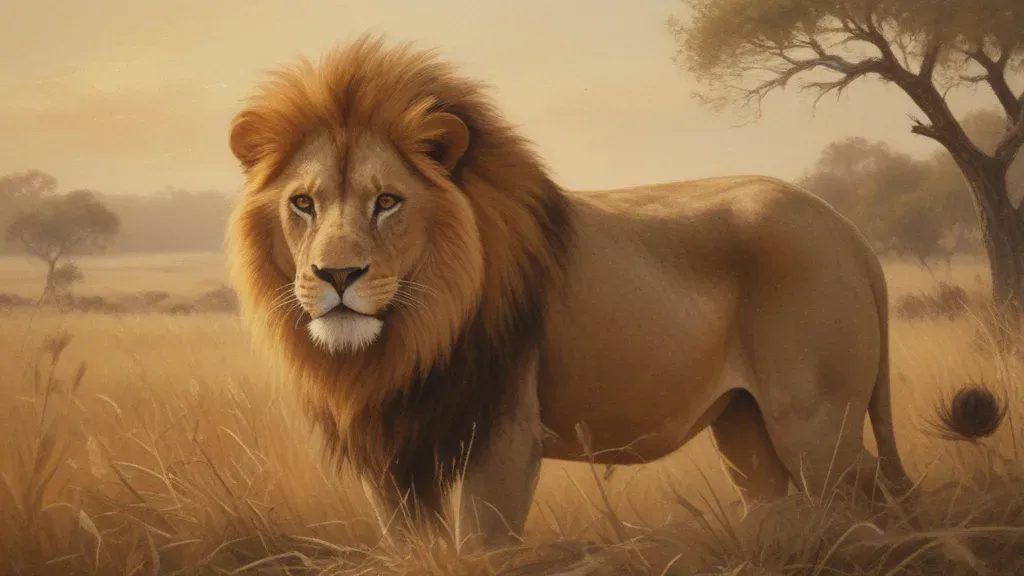 A powerful lion walks confidently across a golden savanna under warm sunlight, creating soft shadows and highlights. The shallow depth of field draws focus to the lion, while the sparse acacia trees and dry grassland in the background provide a natural setting.