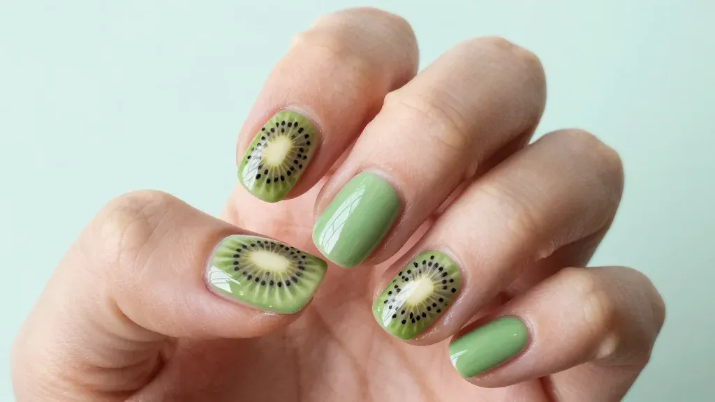 A hand holds a glossy kiwi slice against a matte finish, with soft diffused lighting highlighting the textures. The shallow depth of field ensures the focus remains on the hand and the kiwi, with a clean, light-colored background.