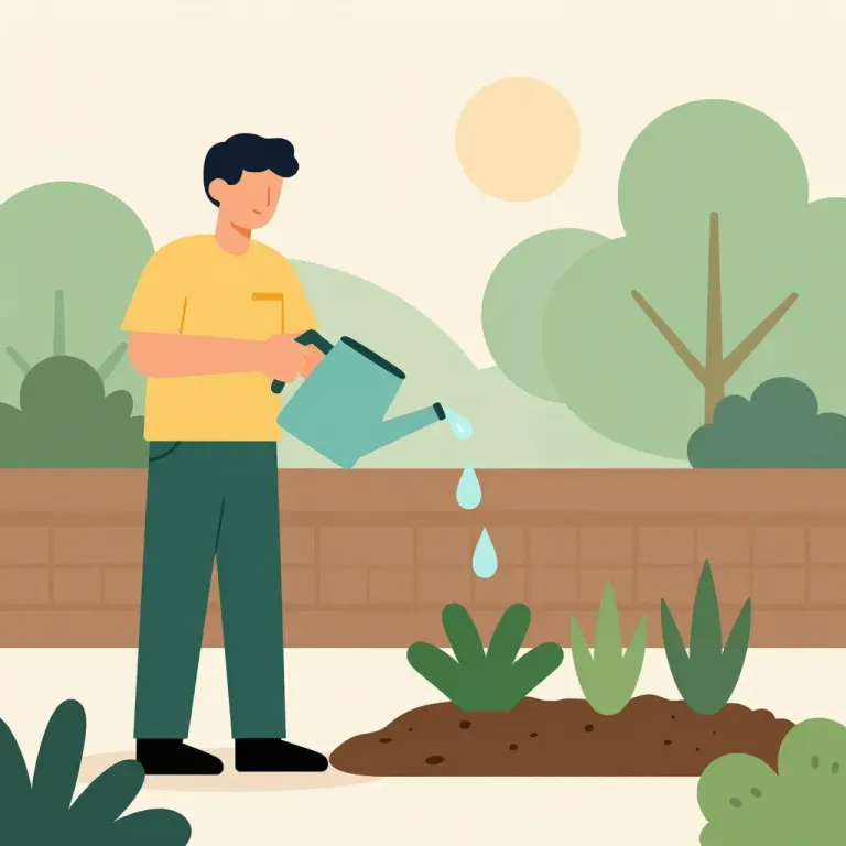 A man carefully waters plants with a teal watering can in a sunny garden setting. The warm, golden sunlight casts soft shadows, highlighting the moist soil and vibrant greenery.