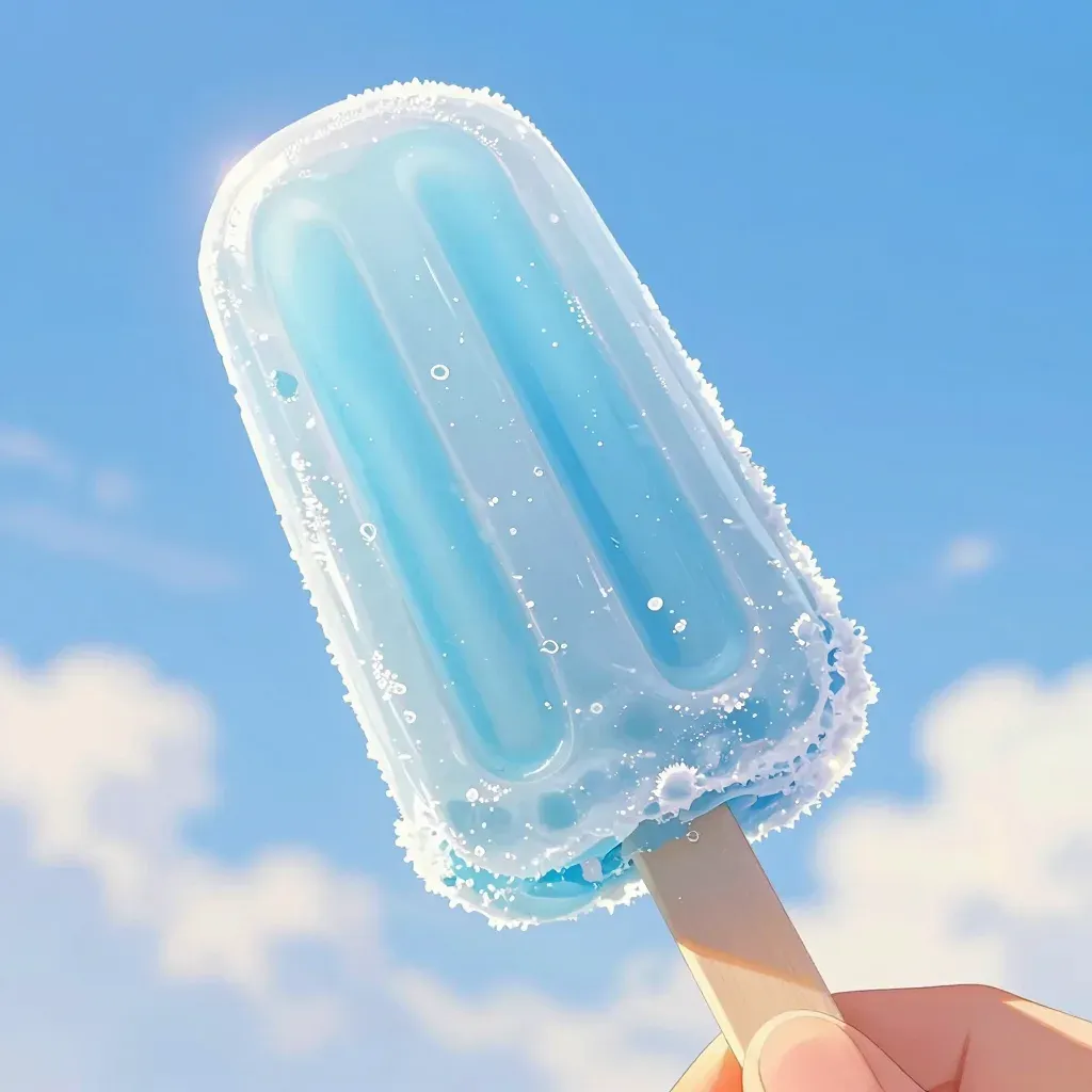 A hand holds a glossy, creamy popsicle against a bright blue sky with scattered clouds, creating a cool and refreshing scene. The warm sunlight highlights the icy texture and smooth surface of the popsicle, emphasizing its coldness and appeal.