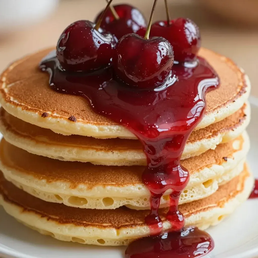 A close-up of a stack of golden pancakes topped with glossy cherry sauce, highlighting the soft texture and vibrant colors under soft, warm lighting. The shallow depth of field blurs the background, focusing attention on the appetizing details of the dish.