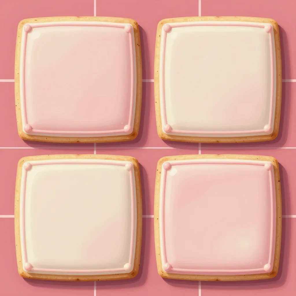 Four iced biscuits with smooth, glossy white icing and golden-brown edges are arranged in a 2x2 grid, set against a slightly blurred pink tile background. The soft, even lighting highlights the texture and glossy finish of the icing, creating a clean and inviting composition.