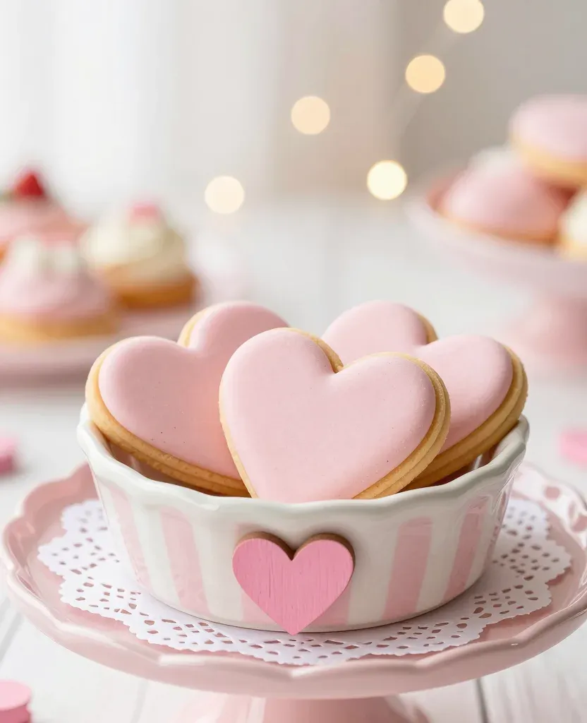 A close-up of heart-shaped cookies with smooth, glossy pink frosting in a bowl, set against a dreamy background of blurred cupcakes and fairy lights. The warm, ambient lighting and shallow depth of field create a soft, festive atmosphere.