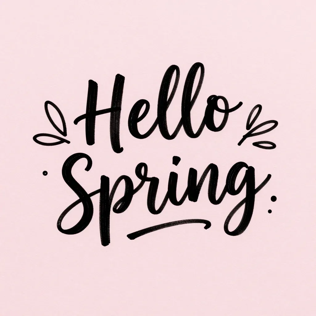 Glossy black ink lettering spells 'Hello Spring' against a soft, pale pink backdrop. The diffused lighting and centered composition create a clean and inviting aesthetic, ideal for spring-themed designs.