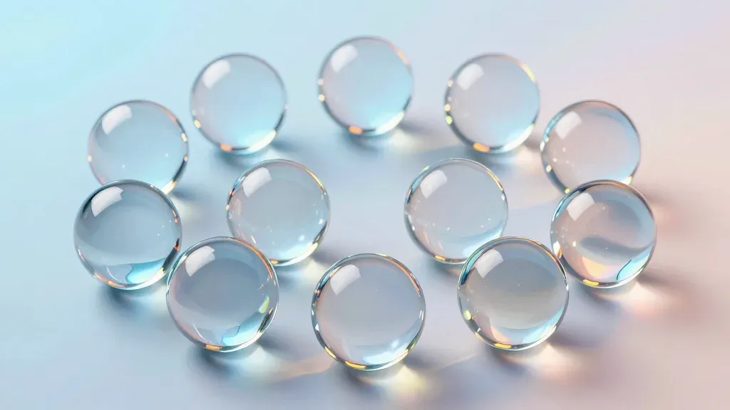 A loose grid of translucent glass orbs with smooth, glossy surfaces and reflective highlights, illuminated by warm, golden light from above, creating a soft, ethereal atmosphere. The soft white background and shallow depth of field emphasize the orbs, making them the focal point of the composition.