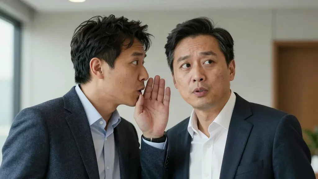 Two men in formal attire engage in a serious, hushed conversation, their faces close together, illuminated by soft, diffused light. The neutral tones and shallow depth of field create an intimate and focused composition, emphasizing the intensity of their exchange.