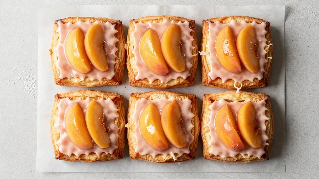 Golden-brown peach danish squares are arranged neatly, showcasing glossy peach slices and a translucent glaze under soft, diffused lighting. The neutral background enhances the vibrant colors and textures of the pastries, making them visually appealing for culinary and food photography.