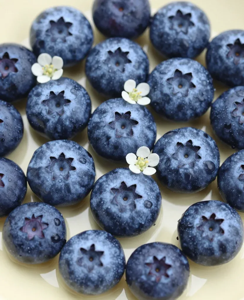 A cluster of fresh blueberries with small white blossoms nestled among them, showcasing a waxy, glossy skin texture under soft diffused lighting. The shallow depth of field and centered composition emphasize the berries against a smooth, out-of-focus cream background.