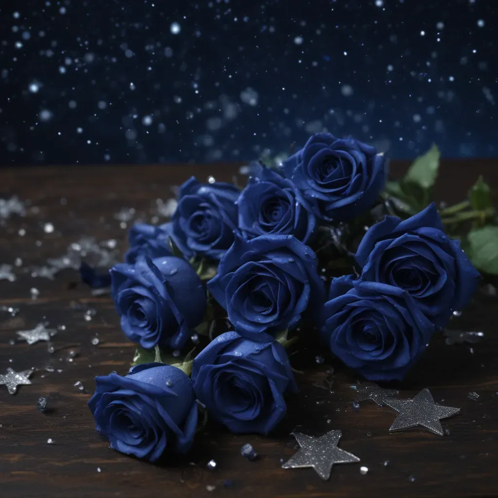 A bouquet of midnight-blue roses glistens under soft, diffused light, highlighting their velvety petals and glossy surface. The shallow depth of field and starry night background create a dreamy, ethereal atmosphere, ideal for romantic or mysterious themes.