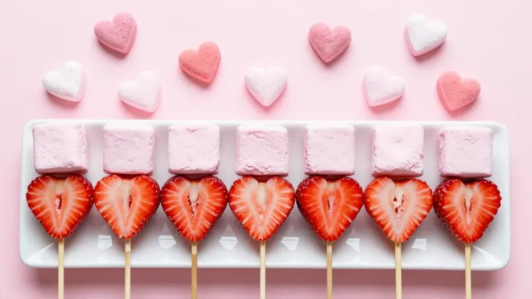 Glossy, juicy heart-shaped strawberry slices and soft, fluffy marshmallows are arranged on wooden skewers, set against a clean, light pink background. The soft, diffused lighting highlights the textures and creates a visually appealing composition.