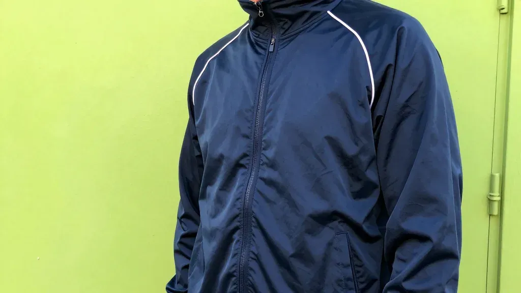 A close-up of a navy blue track jacket with white piping, displayed against a vibrant neon green wall. The even, bright lighting highlights the jacket's smooth, glossy fabric and reflective surface, creating a striking contrast with the background.