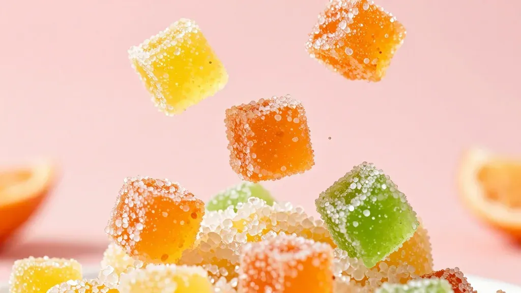 Glossy, sugary citrus candy cubes in vibrant orange, green, and yellow burst dynamically in mid-air, illuminated by bright, diffused light from above, creating highlights and reflections. The soft pink background provides a clean and simple backdrop that makes the candy stand out, offering ample copy space for design integration.