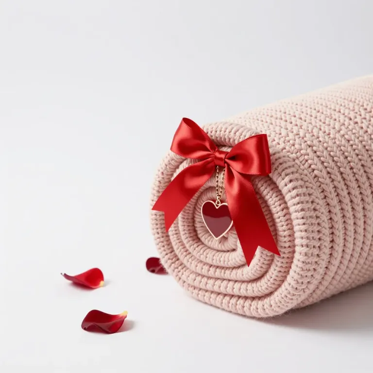 A rolled-up pink knitted blanket adorned with a glossy red ribbon and a delicate heart-shaped pendant, softly lit from above, creating gentle shadows and highlighting the textures. The minimalistic white background with scattered rose petals emphasizes the subject and provides ample copy space.