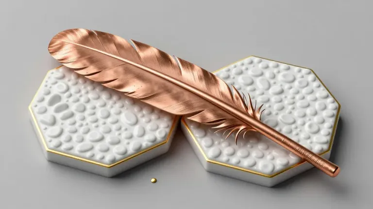 A glossy copper quill rests elegantly on a textured white surface, highlighted by soft, diffused lighting that creates a warm, golden glow. The minimalist background ensures the focus remains on the quill and surface, making it ideal for design elements or luxury branding.