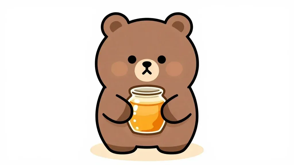 A cartoon bear enjoys a glass of honey, with glossy fur and golden honey creating a warm, inviting atmosphere. The soft, diffused lighting and neutral white background emphasize the subject and provide ample copy space.