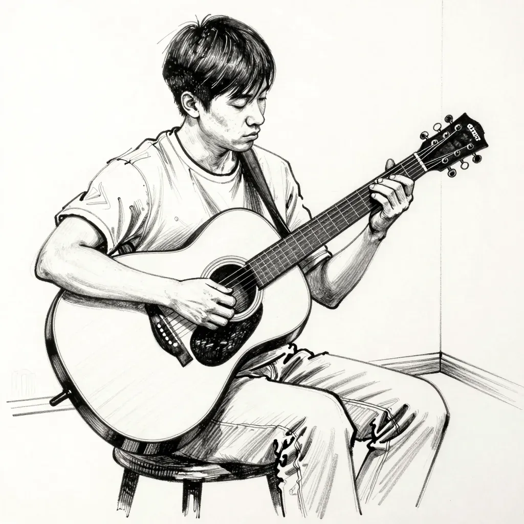 A young man sits and plays an acoustic guitar, his hands skillfully strumming the strings. The soft, diffused lighting highlights the texture of the guitar and the fabric of his shirt, creating a serene and intimate atmosphere.