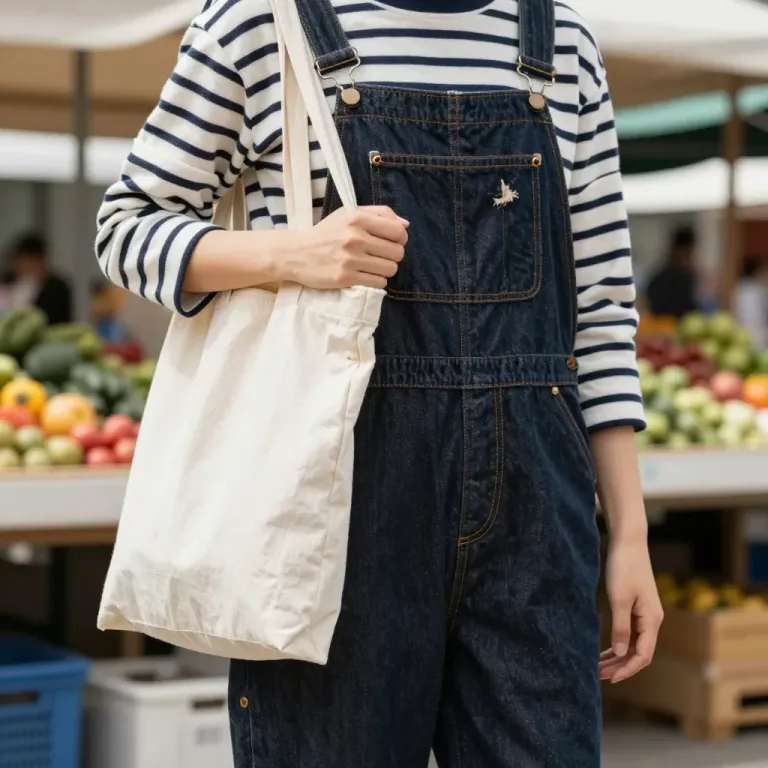 A person wearing denim overalls and a striped shirt holds a white tote bag, with natural light casting soft shadows and highlighting the textures of the clothing and the vibrant colors of the produce in the background. The composition centers the subject with a lively market setting in the background, creating a sense of depth and context.